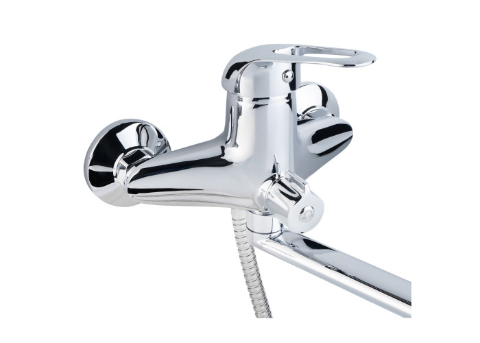 Змішувач для ванни Lidz (CRM) Cosmos 80 005-1 виготовлено із латуні, має довгий вилив і зручне руків‘я. Для вмикання подачі води досить підняти та повернути його в потрібне положення. Змішувач та тримач лійки монтуються на стіну за допомогою кріпильних елементів, які є в комплекті. Круглі хромовані розетки приховають похибки монтажу на обробці ванної кімнати. Перемикання на ручний душ виконується поворотним дивертором.
