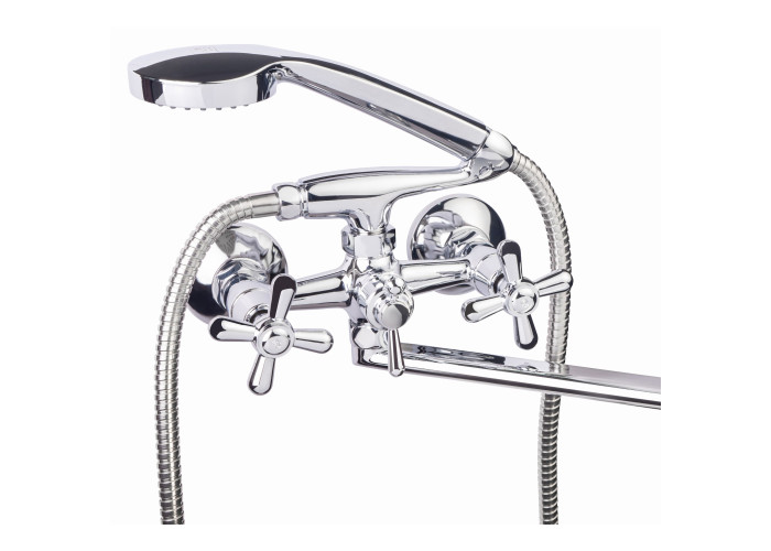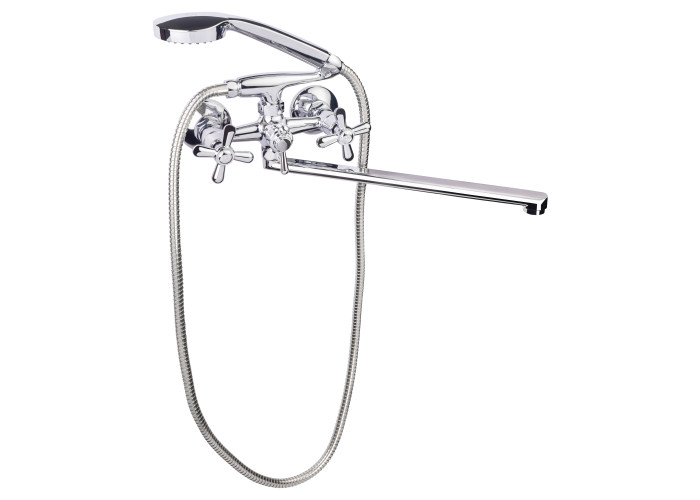 Змішувач для ванни Lidz (CRM) Dominox 15 143 з довгим поворотним виливом виготовлено з латуні, укомплектовано душовим шлангом і лійкою. Завдяки хромованому покриттю має міцну поверхню і привабливий зовнішній вигляд. Для включення потоку води передбачено два вентиля, для перемикання на душ - дивертор. Настінний монтаж здійснюється за допомогою кріпильних деталей, які входять в комплект. Декоративні розетки приховають всі погрішності установки на оздобленні ванної кімнати.