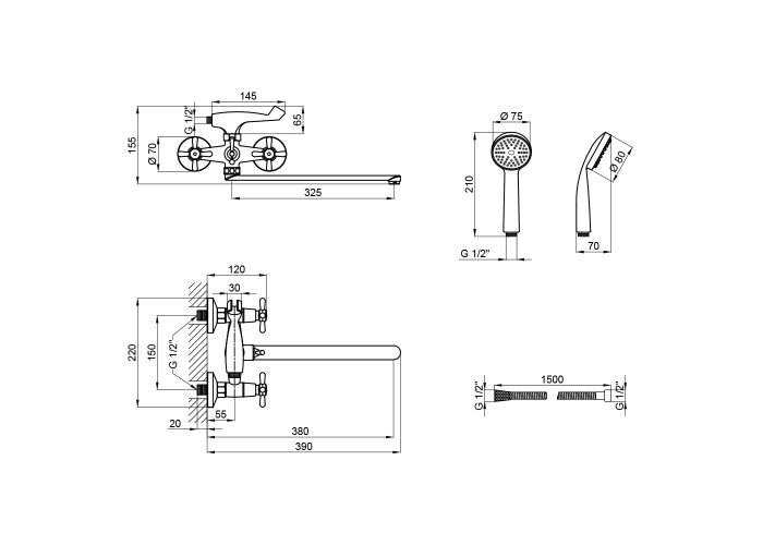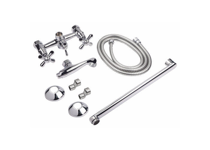Змішувач, душовий шланг, лійка для ручного душу, кріпильні деталі.