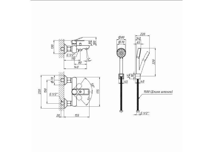 Змішувач, лійка для ручного душу, душовий шланг, кріпильні деталі.