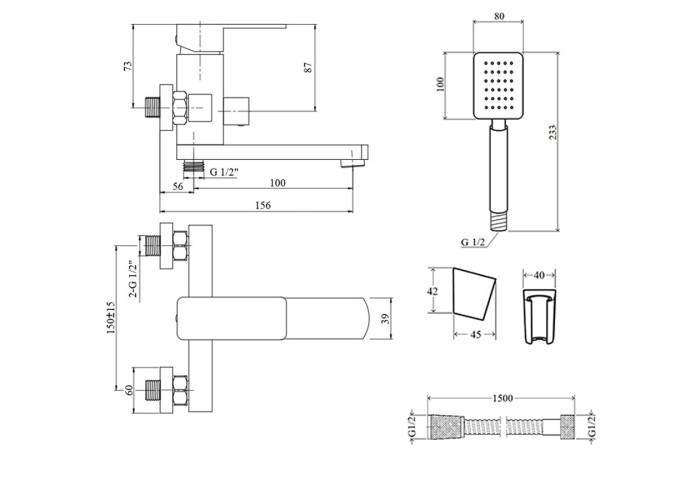 Змішувач, кронштейн для ручного душа, лійка для ручного душа, душової шланг, кріплення.