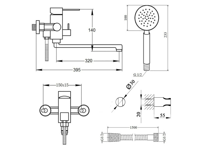 Змішувач, кронштейн для ручного душу, лійка для ручного душу, душовий шланг, кріпильні деталі.