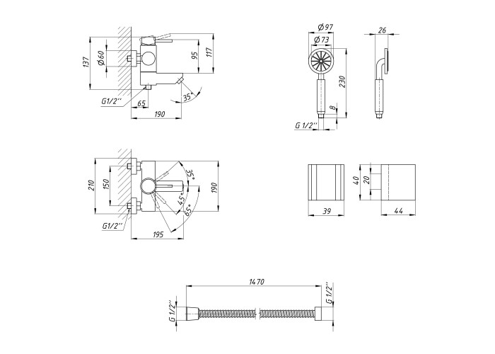 Змішувач, кронштейн для ручного душу, лійка для ручного душу, душовий шланг, кріпильні деталі.