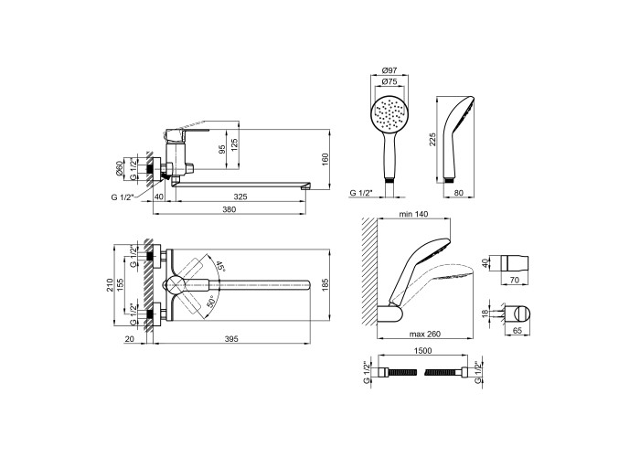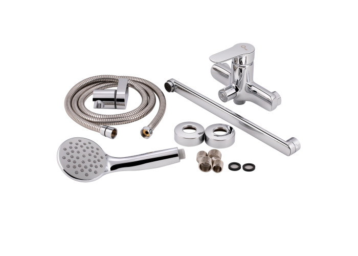 Змішувач, лійка для ручного душу, душовий шланг, кронштейн для ручного душу, кріпильні деталі.