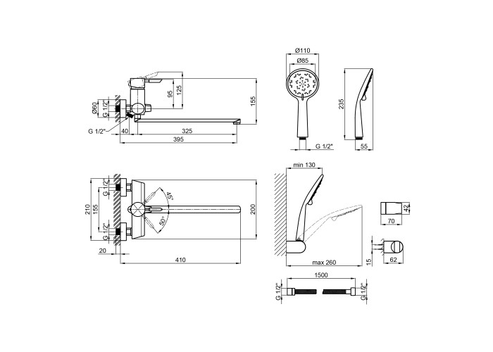 Змішувач, лійка для ручного душу, душовий шланг, кронштейн для ручного душу, кріпильні деталі.