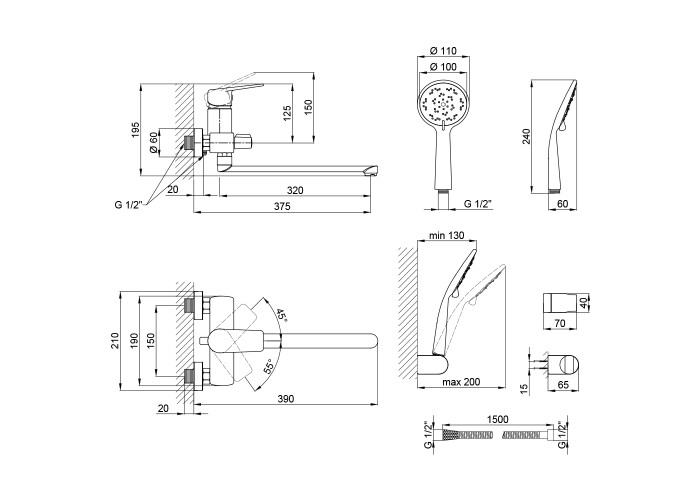 Змішувач, лійка для ручного душу, душовий шланг, кронштейн для ручного душу, кріпильні деталі.