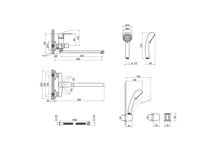 Змішувач, лійка для ручного душу, душовий шланг, кронштейн, кріпильні деталі.