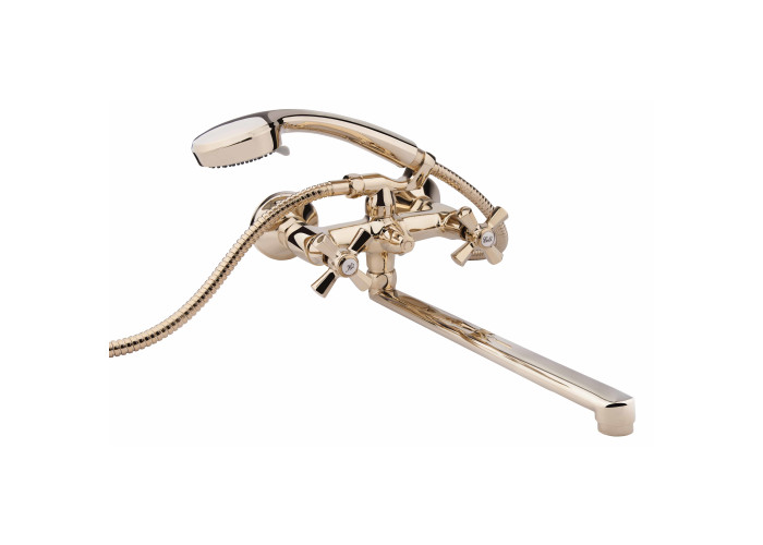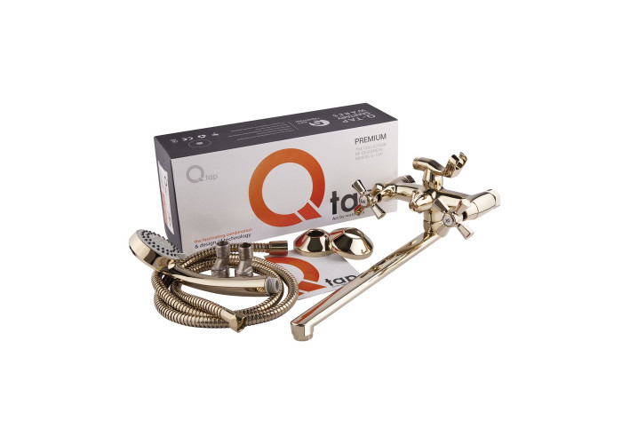 Змішувач для ванни Qtap Liberty ORO 140 з інтегрованим шланговим під‘єднанням виготовлений з міцної та зносостійкої латуні з рівномірним хромованим покриттям золотого кольору, завдяки якому виріб має привабливий зовнішній вигляд й більш стійкий до механічних пошкоджень. У комплекті є лійка та душовий шланг. Подача води здійснюється за допомогою зручних вентилів з маркуванням холодної та гарячої води, а перемикання на душовий режим - поворотним дивертором.