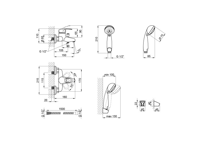 Змішувач, лійка для ручного душу, душовий шланг, кронштейн для ручного душу, кріпильні деталі.