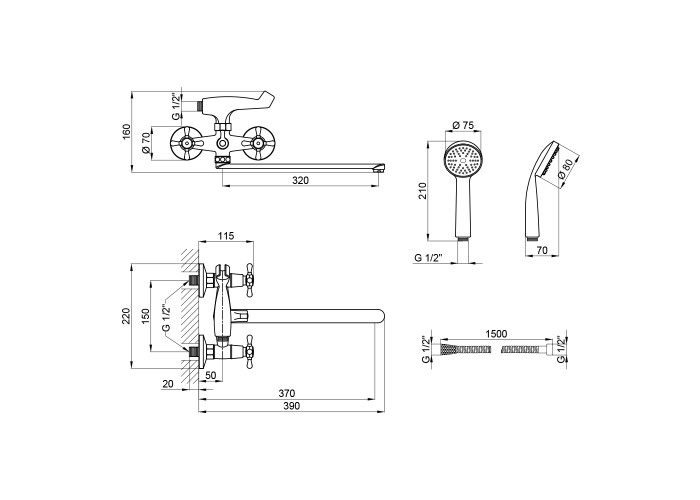 Змішувач, душовий шланг, лійка для ручного душу, кріпильні деталі.