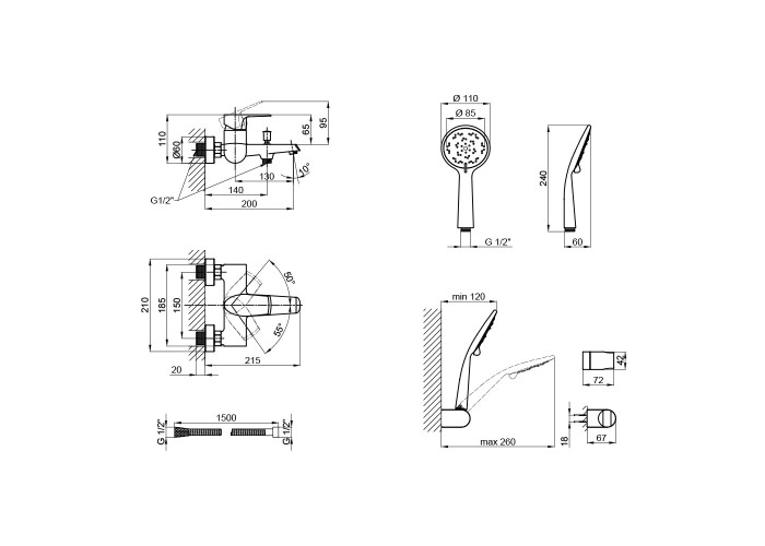 Змішувач, душовий шланг, лійка для ручного душу, тримач для ручного душу, кріплення.