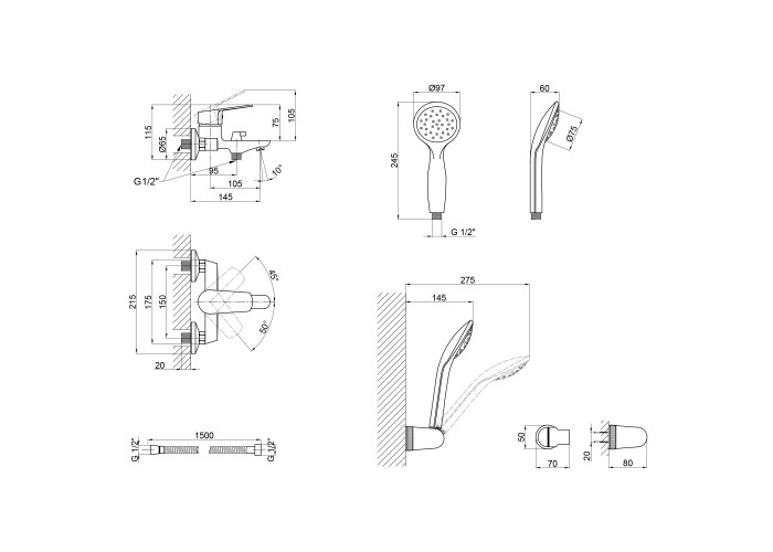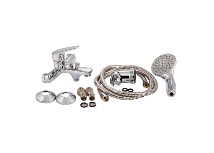 Змішувач, душовий шланг, лійка для ручного душу, тримач для ручного душу, кріплення.