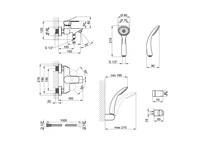 Змішувач, лійка для ручного душу, душовий шланг, кронштейн для ручного душу, кріпильні деталі.
