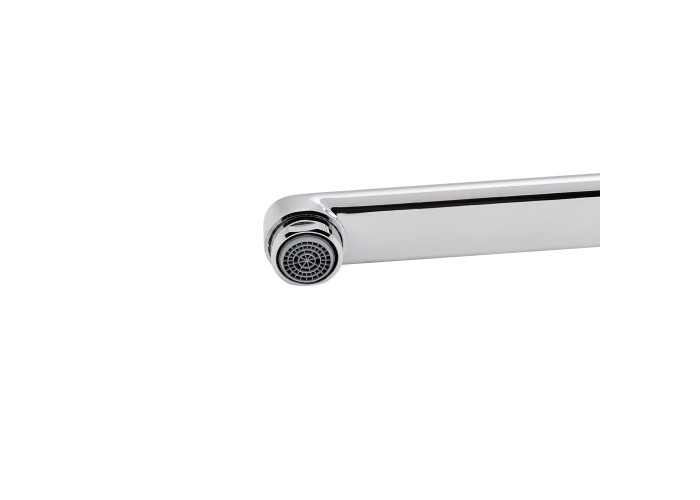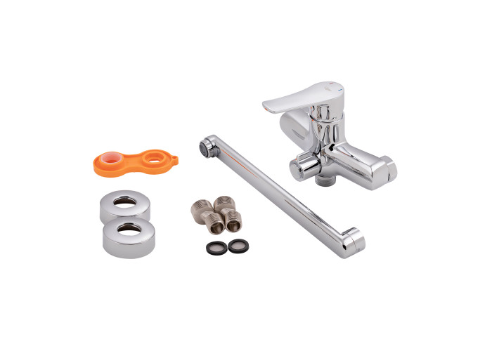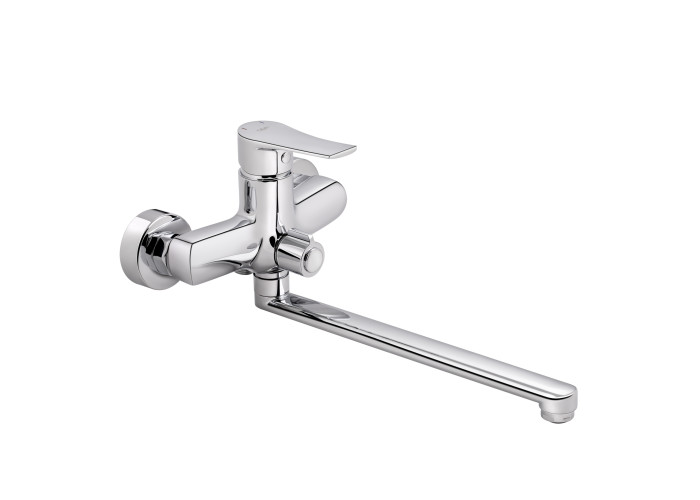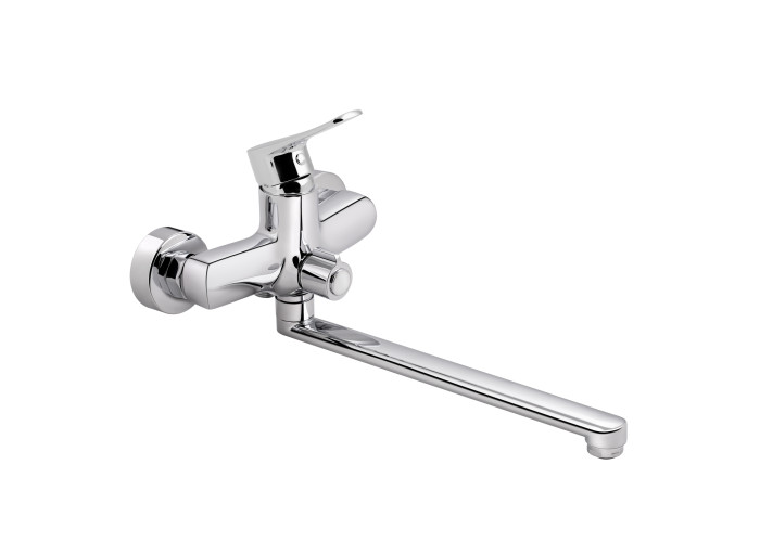 Змішувач для ванни з довгим виливом м виготовлено з міцної та зносостійкої латуні з рівномірним хромованим покриттям, завдяки якому виріб має привабливий зовнішній вигляд та більш стійкий до механічних пошкоджень. Подача води здійснюється за допомогою зручного важеля, а перемикання на душовий режим - дивертором. Декоративні розетки допоможуть приховати похибки монтажу, що виникають при встановленні.