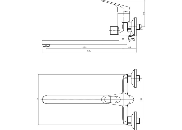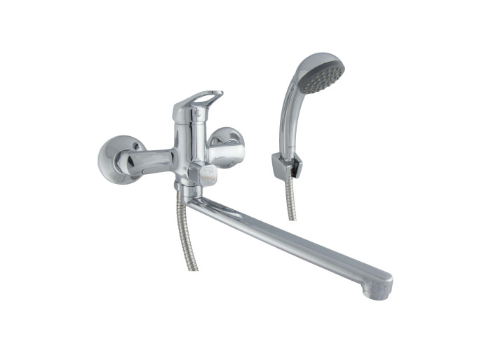 Змішувач для ванни і душа MIXXEN Емшер оснащений іспанським картриджем Sedal з керамічними пластинами під один важіль змішування і регулювання холодної / гарячої води. У стандартну комплектацію входять: дві ексцентричні муфти для настінного монтажу, два декоративних відбивача, душовою шланг, лійка і утримувач. Короткий фіксований вилив обладнаний антистатичним аератором, має перемикач вилив-душ.