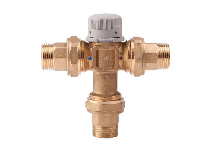 Термостатичний змішувальний клапан. Підключення - внутрішня різьба . Діапазон регулювання температури 30-60 ° C. Максимальна температура води на вході 85 ° C. Бічний вхід (з червоною позначкою) для гарячої води, нижній вхід (з синьою відміткою) для холодної води. Вихід змішаної води розташований збоку.