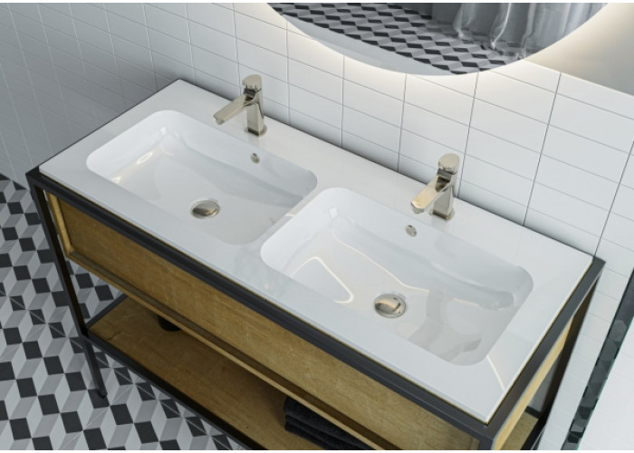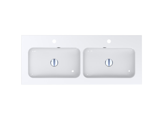 Для каждой чаши предусмотрены отверстия под перелив и смеситель. Умывальник имеет врезной тип монтажа, устанавливается на тумбу или в столешницу.