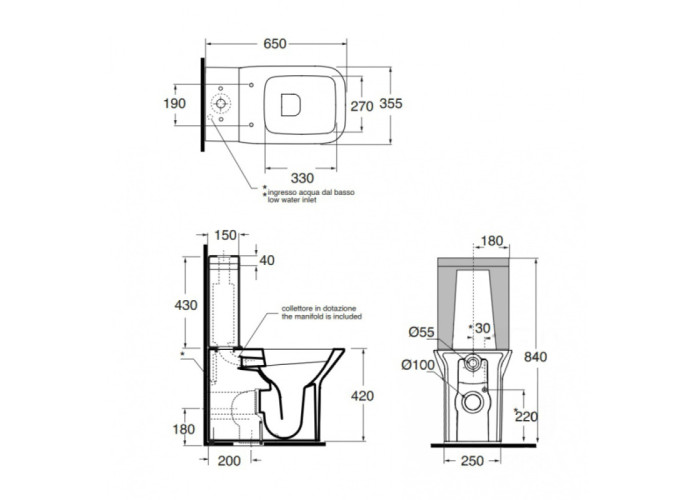 Комплект Azzurra Prua PRU100B1MBP складається з бачка з набірним та зливним механізмами, а також унітазу зі швидкознімним сідінням з системою soft-close, яка забезпечує плавне й безшумне опускання. Чаша унітаза - лійкоподібна, є ідеальним рішенням проблем вилітання бризок і поганого змивання нечистот. На бачку передбачена хромована кнопка, яка при повторному натисканні не працює, тим самим економить витрату води. Установка унітаза на підлогу не вимагає особливих зусиль.