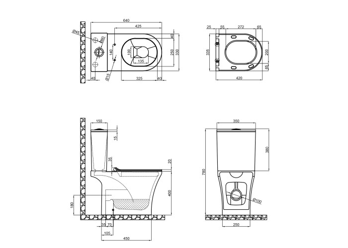 Унитаз, бачок, сливной/наборной механизм, сиденье, крепежи.