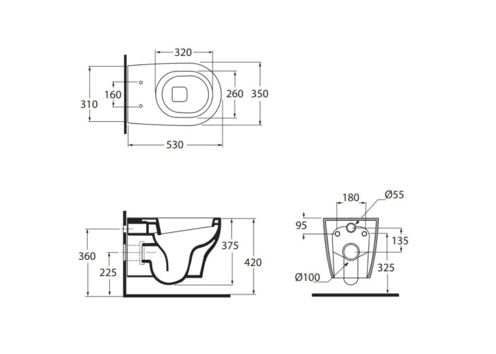 Унитаз: 375х350х525. Сиденье для унитаза: 30х355х410.