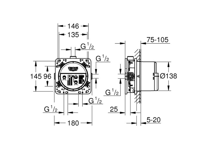 3 трубкообразных отвода 1/2". 2 подключения воды снизу 1/2". Инсталляционная глубина 75-105 мм. Предварительно смонтированная заглушка. Прочный корпус и защитная накладка. Подготовленные точки крепление для сухого и мокрого монтажа уплотнение.