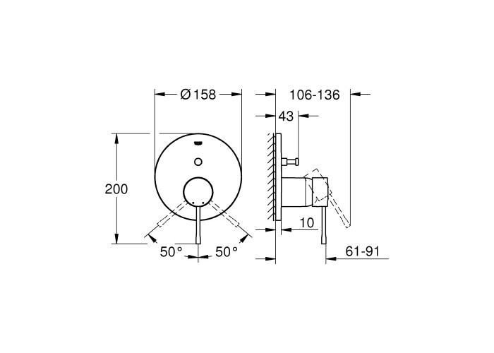 Додаткові характеристики Кругла, декоративна настінна пластина діаметром 15.8 см. Металева настінна накладка, припасування у межах 6°. Пропускна здатність виходів: вихід B = 27 л/хв. Для монтажу з вбудованою частиною змішувача Rapido SmartBox 35600000 від Grohe (купується окремо).
