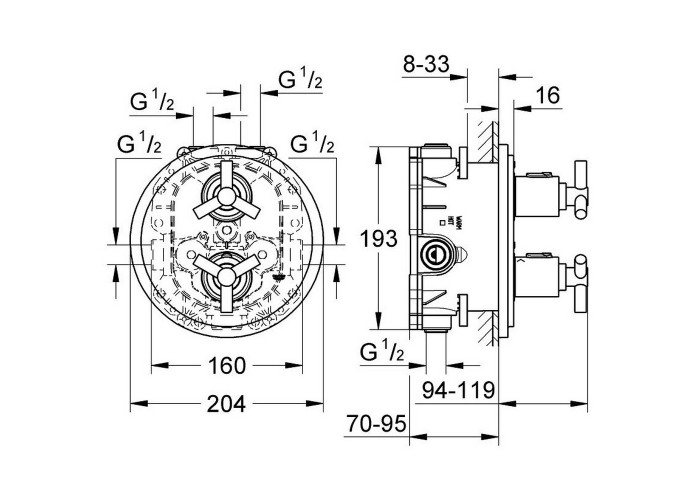 GROHE StarLight - хромированное покрытие. GROHE SafeStop - ограничение температуры воды до 38 °C. GROHE EcoButton - снижение потребления воды до 50%. GROHE EcoJoy - водосберегающая технология. GROHE SilkMove - плавность хода рычага. GROHE TurboStat - обеспечение и поддержание температуры воды. GROHE EasyLogic - четкая маркировка на корпусе. GROHE AquaDimmer - легкое переключение между потребителями.