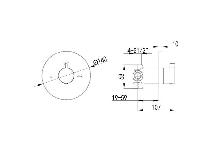 ZAMEK запорный/переключающий вентиль (3 потребителя), встраиваемый в стену, круглая форма накладки, латунь.