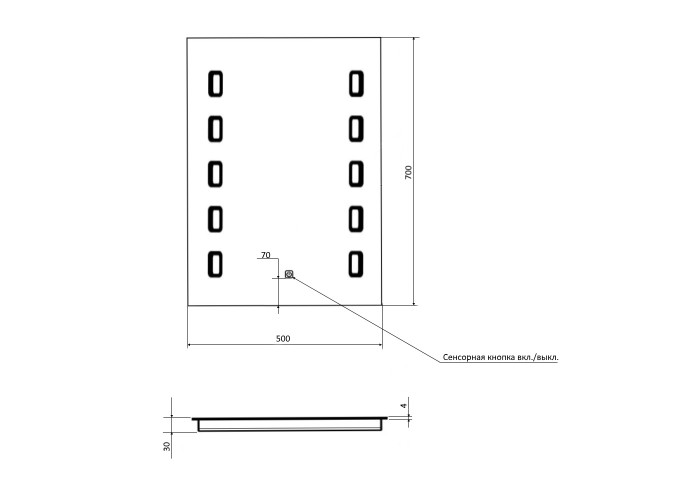 Зеркало Potato P782 укомплектовано светодиодной лентой с ровным, насыщенным, ярким свечением белого цвета и сенсорной кнопкой на передней части зеркала. Сенсорная кнопка подсвечивается в выключенном режиме красным цветом, а в включённом - синим. LED-подсветка по краям в виде прямоугольников идеальна для проведения бритья или косметических процедур. К преимуществам также можно отнести такие немаловажные факторы, как низкое энергопотребление и легкий монтаж: зеркало крепиться шурупами.